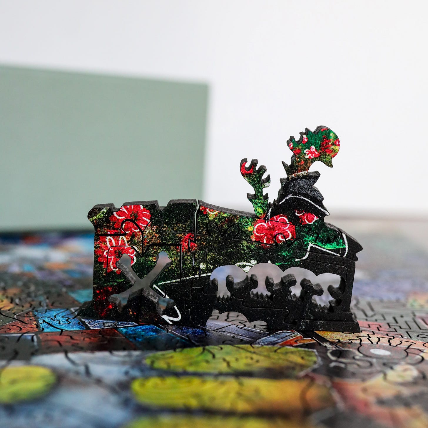 This story of transformation is built into the very fabric of the puzzle. You will find whimsical puzzle pieces of bats and rats, but also a mirror to represent self-reflection and beautiful red roses in full bloom (thorns intact). As with any puzzle, solving it can be approached as a collaborative act, a process that gives back to you and those you share it with. It’s an embodied artifact of Generosity, a testament to the idea that by giving more than you take, you build something that is whole and beautiful.